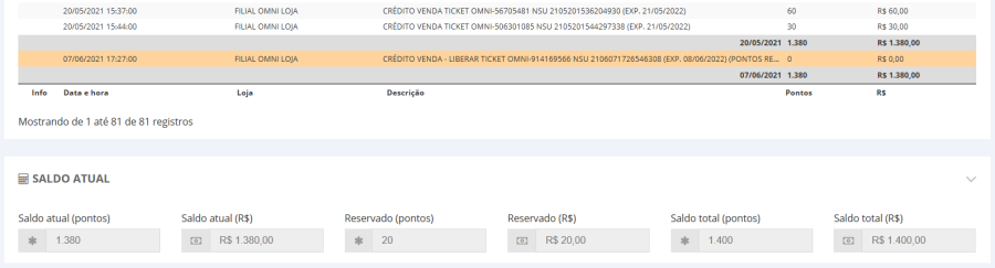 Na tela de consulta do Reshop, podemos ver que há um lançamento aguardando liberação e abaixo temos as reservas referentes aos pontos, ao valor da venda e a atualização dos saldos do cliente.
