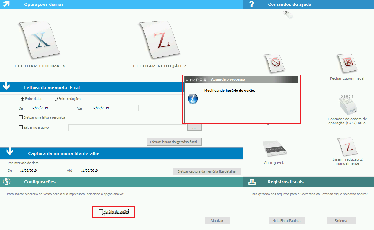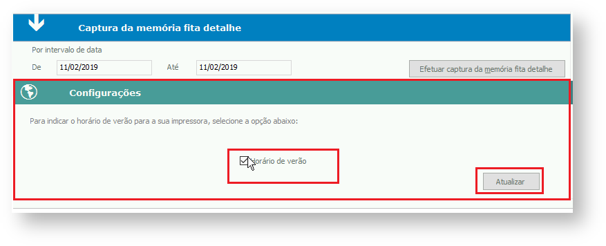 1. No menu Caixa, Gerenciamento Fiscal, em Configurações, marque a opção Horário de Verão e clique no botão Atualizar.