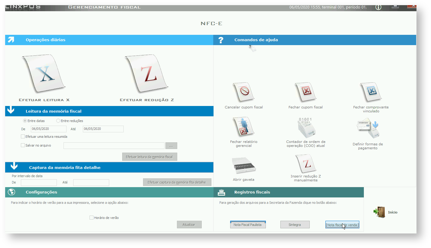 Nesta opção são realizadas as operações de caráter fiscal como a Leitura X e a Redução Z, geração do Sintegra, leitura da memória fiscal, cancelamento de cupons, dentre outras.