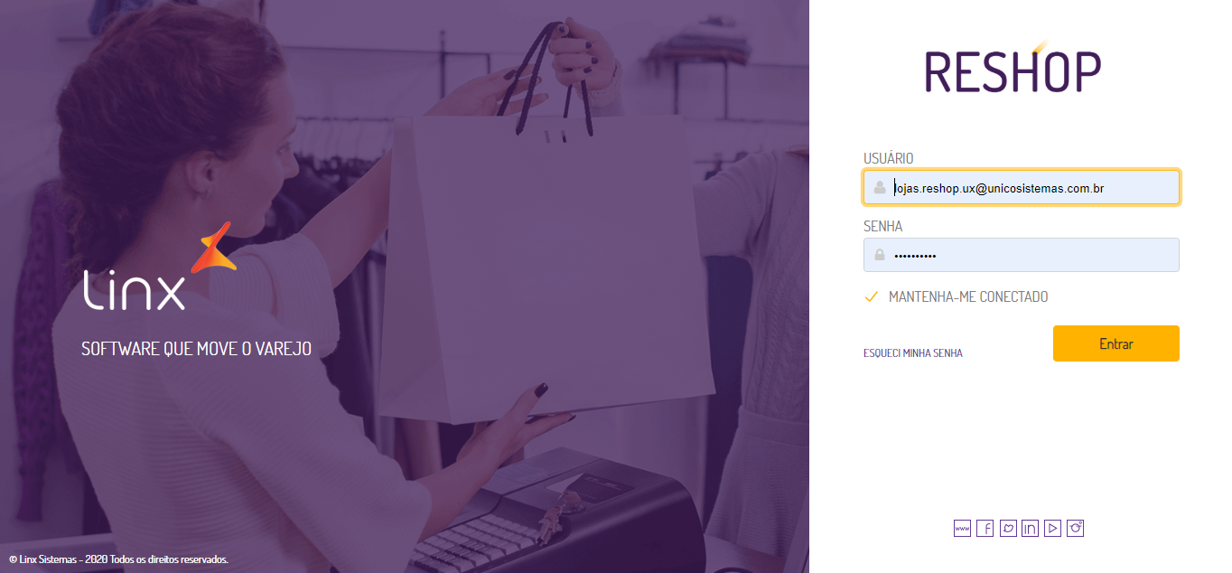 Para garantir que o pedido do e-commerce tenha sido gerado com sucesso, acesse o portal: https://reshop.linx.com.br/Account/Login