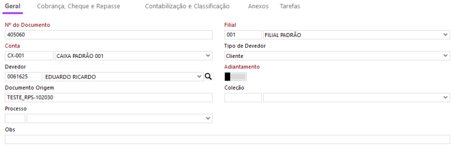- Na guia Geral, na parte superior da tela, preencha os campos: