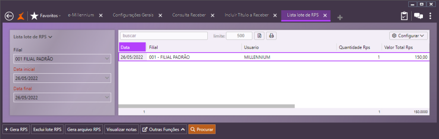 - Acesse a tela Lista Lote de RPS pelo caminho: Controladoria > Fiscal > Gera Lote RPS;
