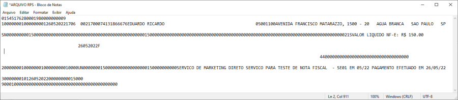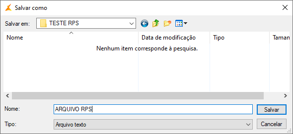 Para a validação do arquivo de Lote RPS gerado, vá até o local onde foi salvo o arquivo e verifique se ele foi gerado de acordo com o esperado.