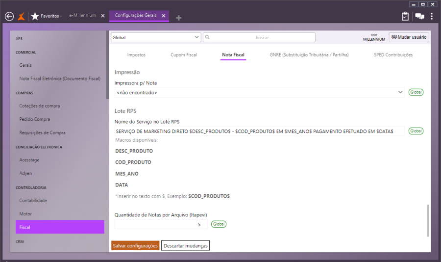 Obs.: há quatro opções de macros disponíveis para incluir no nome do serviço: DESC_PRODUTO, COD_PRODUTO, MÊS_ANO e DATA. Basta inserir no texto entre cifrões. Exemplo: $COD_PRODUTO$.