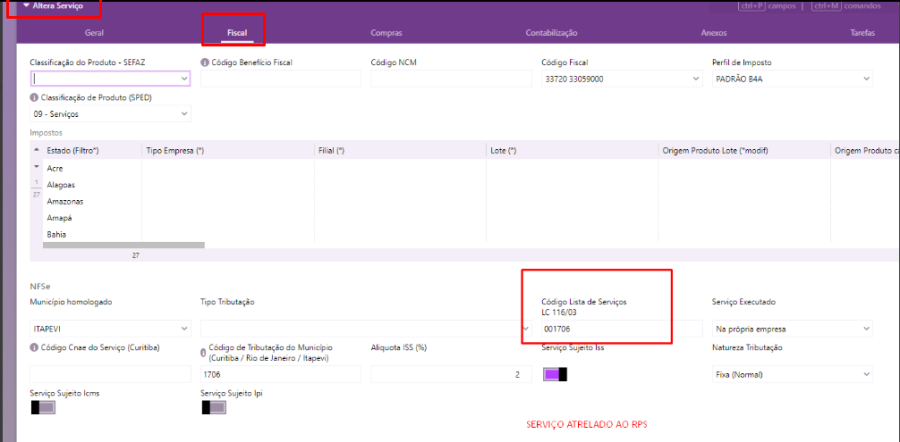 Dentro do tipo de produto, ao alterar o Serviço deve-se estar configurado conforme o print abaixo + a configuração do parâmetro: