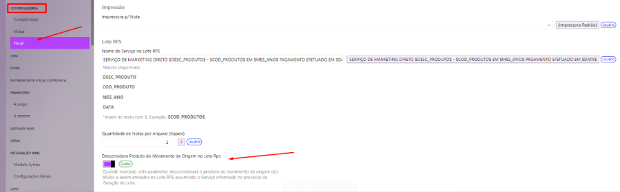 Caminho para aplicar a configurações: Menu\Utilitário\Configurações Gerais \ Controladoria \ Fiscal – Habilitar a Flag "Desconsidera Produto do movimento de Origem no lote".