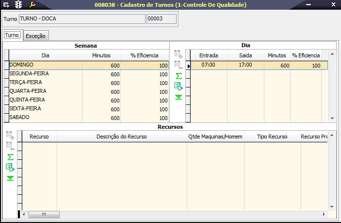 Os campos exibidos nesta página são os mesmos da página Turno. Entretanto, podem ser utilizados para cadastramento de exceções, como expediente parcial em dias de feriado, redução da capacidade produtiva em período de festas, entre outros.