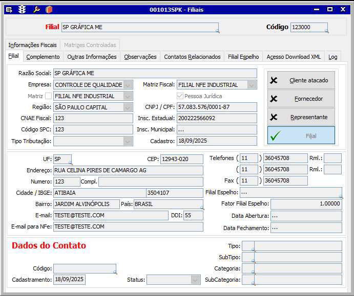 Nesta guia o usuário cadastra todos os contatos relacionados a esta Filial.