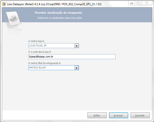 11. Caso seja a primeira vez que for realizar o recebimento de Datasync na loja, informe os campos solicitados A minha loja é e A minha filial da retaguarda é.
