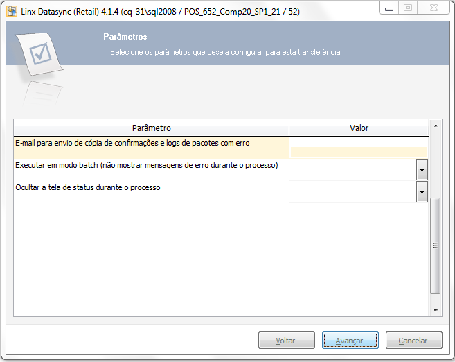 Executar em modo batch (não mostrar mensagens de erro durante o processo) | Sim – Não mostra a mensagem de erros durante a importação ou exportação do Datasync, mas grava no log todas as tabelas que tiveram problemas para importar. Não – Mostra as mensagens de erro durante a importação ou exportação do pacote. |
