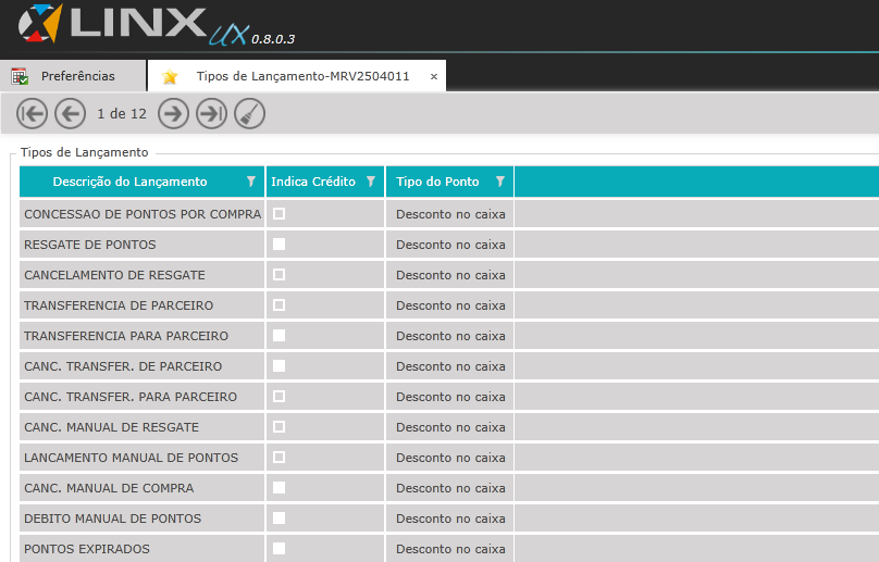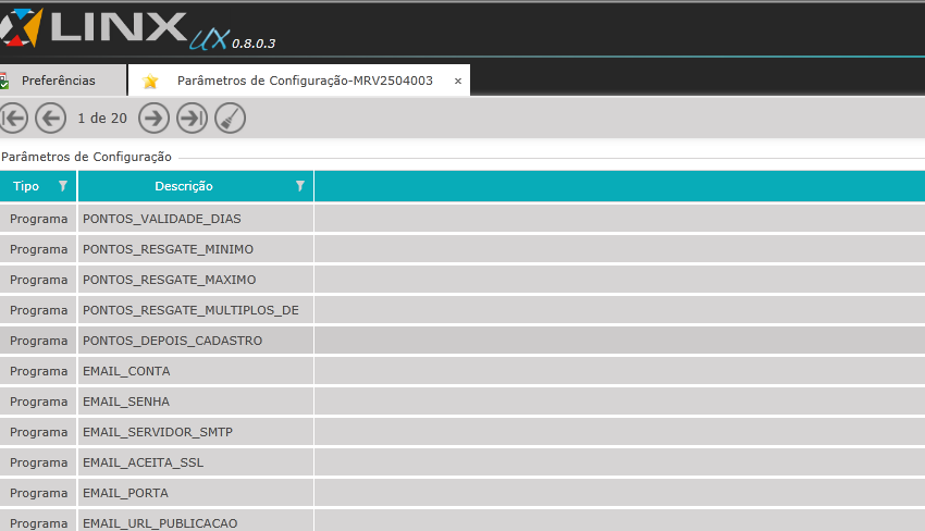 Nessa tela é possível verificar quais os Parâmetros para configuração do Programa de Fidelidade, como por exemplo, quais parâmetros usar para informar se é uma “Transferência de Pontos”, descrever a “Validade dos Pontos em Dias”, entre outros: