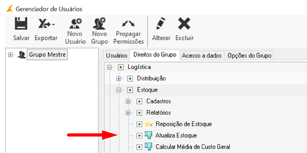 Após a instalação do módulo, acessar o Gerenciador de Usuário do sistema e liberar o link Atualiza Estoque, em Logística > Estoque.