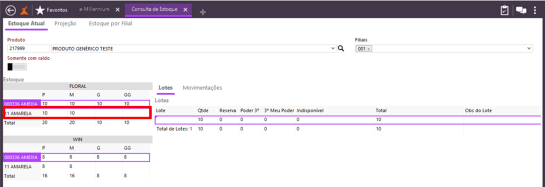 Observe que a quantidade total para o produto consultado são 108 peças em estoque, somando todos os SKUs, na filial 001.
