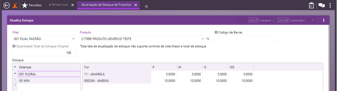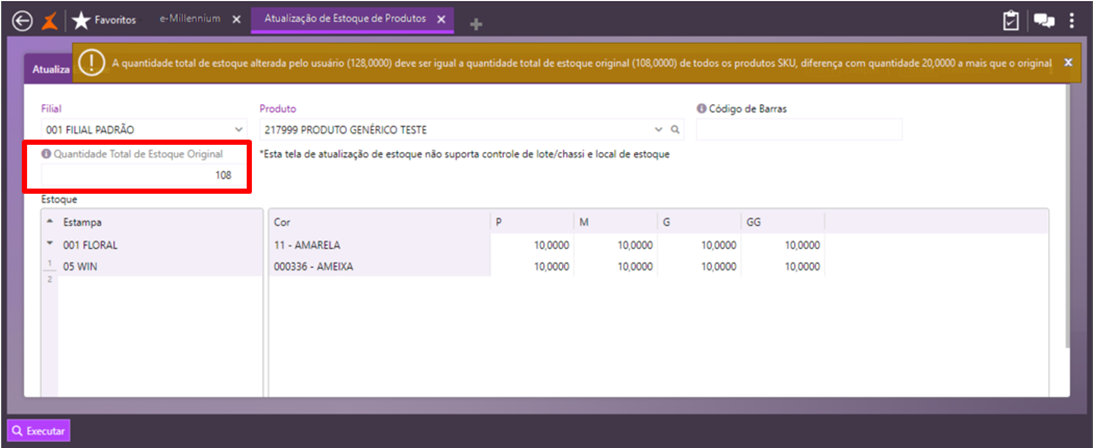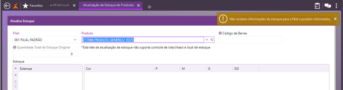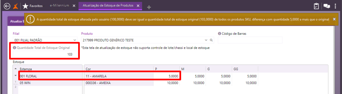 A validação também ocorrerá no caso de quantidades lançadas a menos que a original do estoque do produto. Portanto, somente serão permitidas atualizações que não afetem a quantidade original do produto, exibida na consulta de estoque.