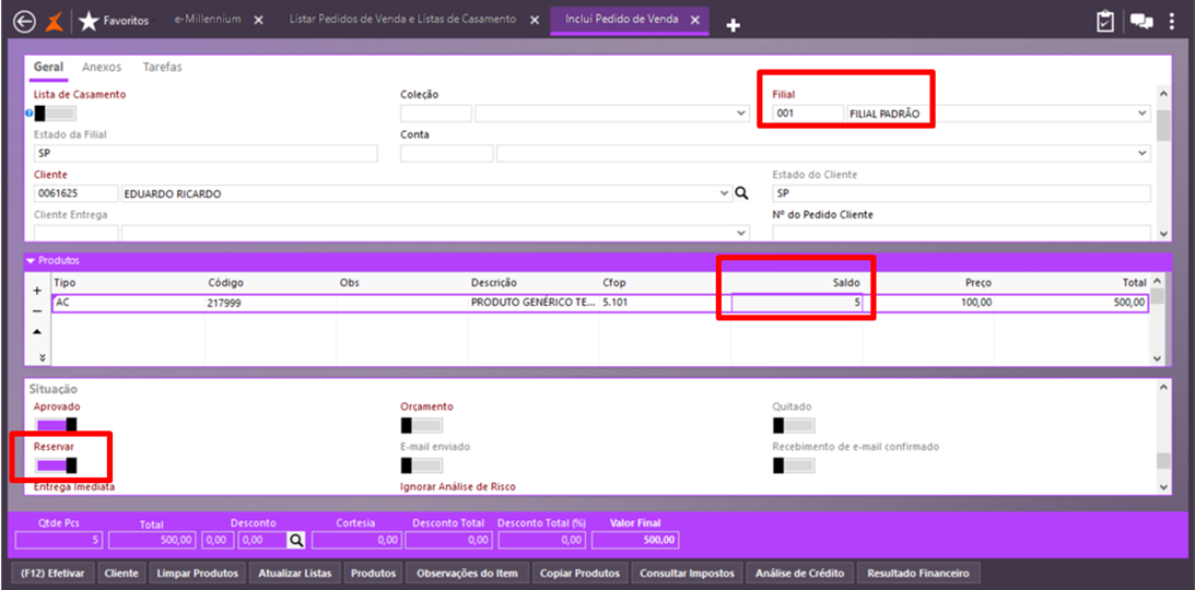 Inclusão de pedido de venda com reserva