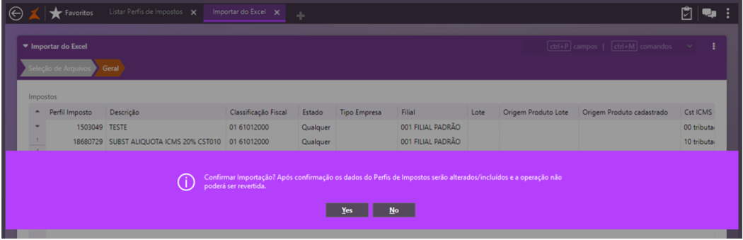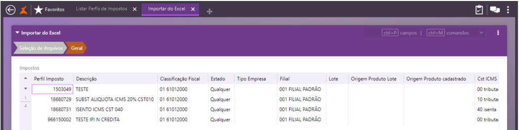 - O sistema identificará se trata-se de uma Inclusão ou Alteração com base nas colunas PERFIL_IMPOSTO e DESCRICAO. Sendo assim se o PERFIL_IMPOSTO e/ou DESCRICAO já existir na base de dados será realizada uma alteração, caso contrário será feita uma Inclusão.