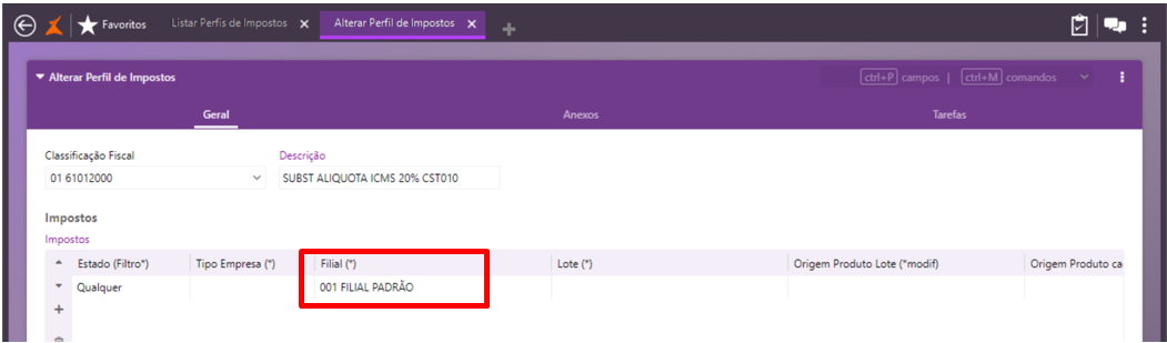 - É obrigatório que para um mesmo Perfil Imposto os campos do cabeçalho do cadastro sejam idênticos para o mesmo Perfil. Os campos do Cabeçalho são (PERFIL_IMPOSTO, DESCRICAO, CLASSIFICACAO_FISCAL (código interno, código externo e descrição). Por exemplo: