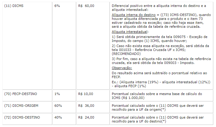 O item (73) ICMS-DESTINO é pré-cadastrado na tela 009003 - Imposto para atendimento à Nota Técnica 2015/003. Será utilizado para o cálculo do diferencial da alíquota ((11) DICMS).
