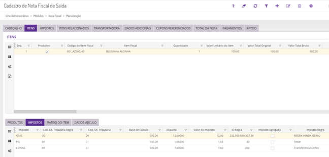 Linx Administrativo > Módulos > Nota Fiscal > Manutenção > Cadastro de Nota Fiscal de Saída