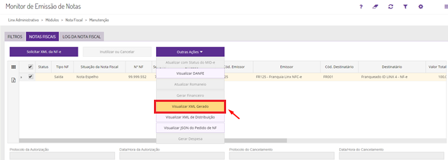Retorne para a guia Notas Fiscais, selecione a nota fiscal e clique em Outras ações: