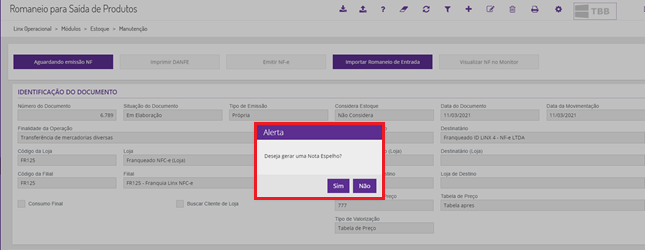 Nesse momento é exibida a pergunta: Deseja gerar uma Nota Espelho?