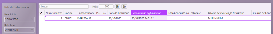 Faça uma nova consulta na tela de embarques e perceba que o status foi alterado para Embarque Concluído. Se for necessário visualizar as informações de data e usuários que efetivaram o embarque, consulte as colunas de inclusão e conclusão dos embarques e os respectivos usuários que realizaram as operações.