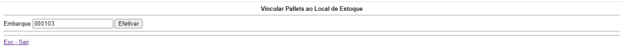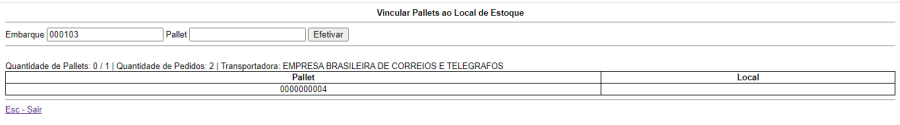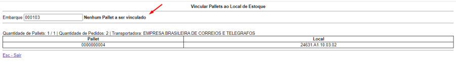 Feito isso, o sistema informa que não há mais nenhum pallet no embarque para ser vinculado ao local de estoque, que poderá ser agora finalizado.