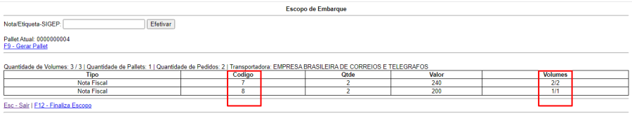 Perceba que abaixo da numeração da nota foi exibida a numeração do pallet atual. O sistema criou um escopo de embarque e nele podemos visualizar que, até o momento, foi incluída a nota fiscal número 7 e que nela há duas quantidades e dois volumes.