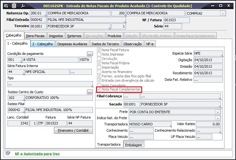 | NF Entrada | Trata-se do número da Nota Complementar de Entrada |