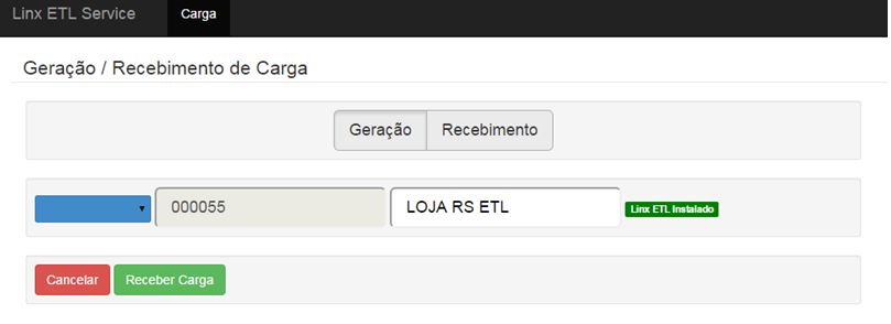 2. Será exibida a tela Geração / Recebimento de Carga conforme exemplo abaixo (opção Recebimento).