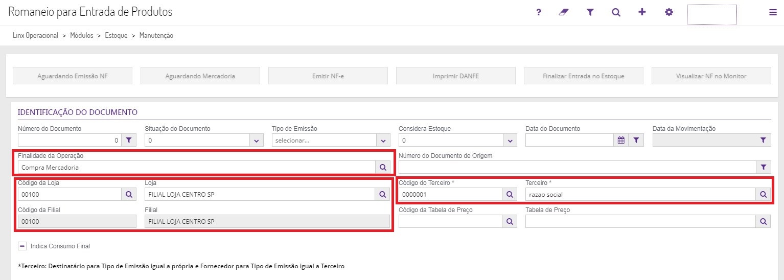 Preencha os campos Finalidade da Operação, Loja e Terceiro e Tabela de Preço. Caso a operação seja voltada para o consumidor final, clique no flag Indica Consumo Final.