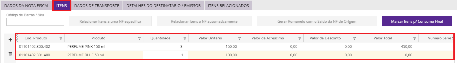 Na guia Itens lance os itens do romaneio manualmente um a um, por bipagem do código de barras ou através de importação de arquivo.