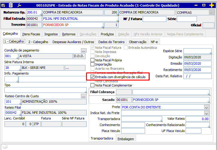 A tela 005103 - Entrada em Separado Fiscal e Físico recebeu blindagem no campo Qtde Item da guia Itens Fiscais, que passou a ser bloqueado para edições nos casos em que houverem dados na guia Materiais e a opção Divergência de Cálculo estiver selecionada.