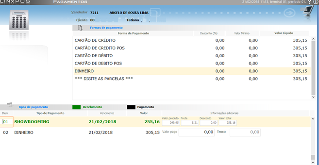 - Na tela de pagamento existirá uma parcela gerada automaticamente somente com o valor dos itens de entrega futura (Showrooming), onde não será possível alterá-la.