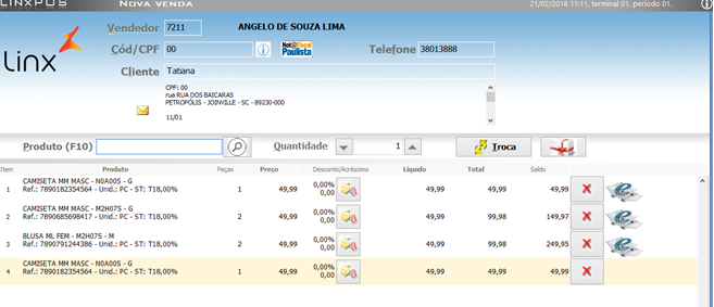 - No pedido é possível inserir itens adicionais à venda, efetuar desconto nos itens e/ou no subtotal e efetuar troca.