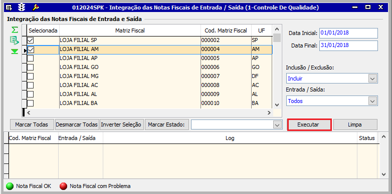 4. A tela 012024 - Integração das Notas Fiscais de Entrada / Saída é responsável pela integração fiscal das notas fiscais com os livros dos registros de entrada e saída, de acordo com o período e filial. Preencha os campos necessários e clique em Executar.