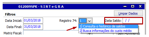Registro 74 | Escolha uma das opções para que seja gerado o registro 74. Opção 1: Consulta o histórico de saldos. Nesse caso deverá ser informada a data do saldo. Opção 2: Busca informações do custo médio. Nesse caso deverá ser informado o código do custo médio. |