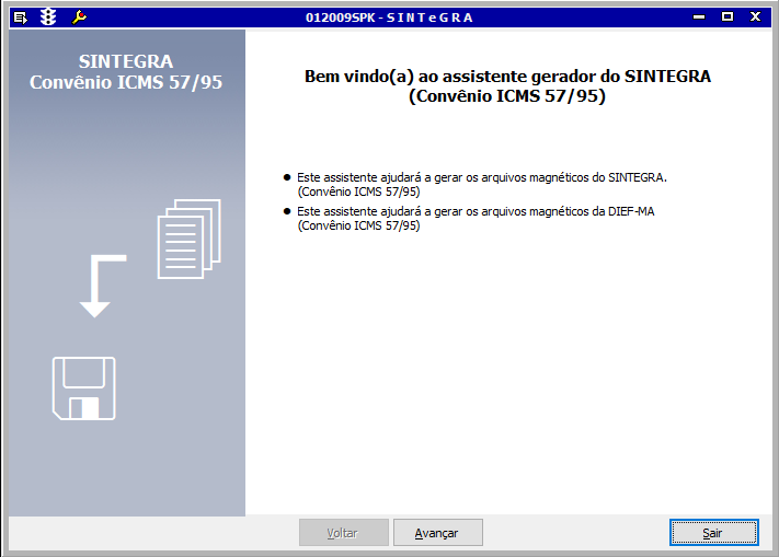 A tela 012009 - Sintegra funciona como um assistente que ajudará a gerar os arquivos magnéticos do Sintegra.