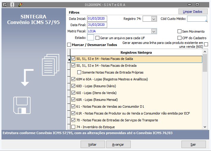 Após a integração das notas fiscais no livro fiscal, é possível gerar o txt do sintegra pela tela 012009 - SINTEGRA.