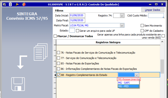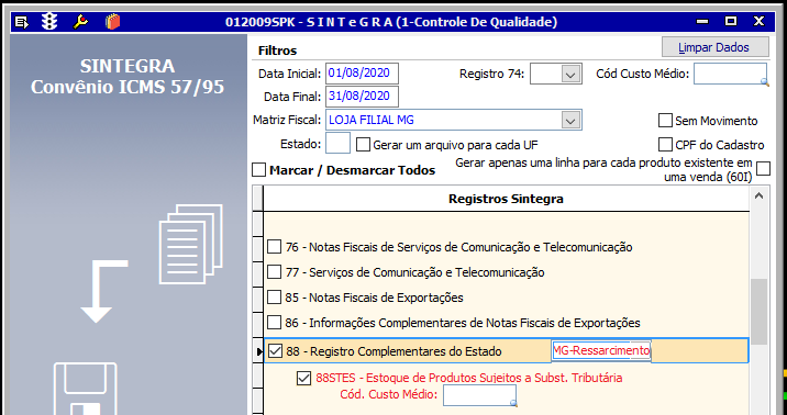 A geração do Sintegra a partir do Linx ERP foi implementada para contribuintes que possuem a UF MG (Minas Gerais) a fim de incluir a geração dos registros 88STES, 88TITNF, 88EAN e 88DV, referentes ao e-Ressarcimento.