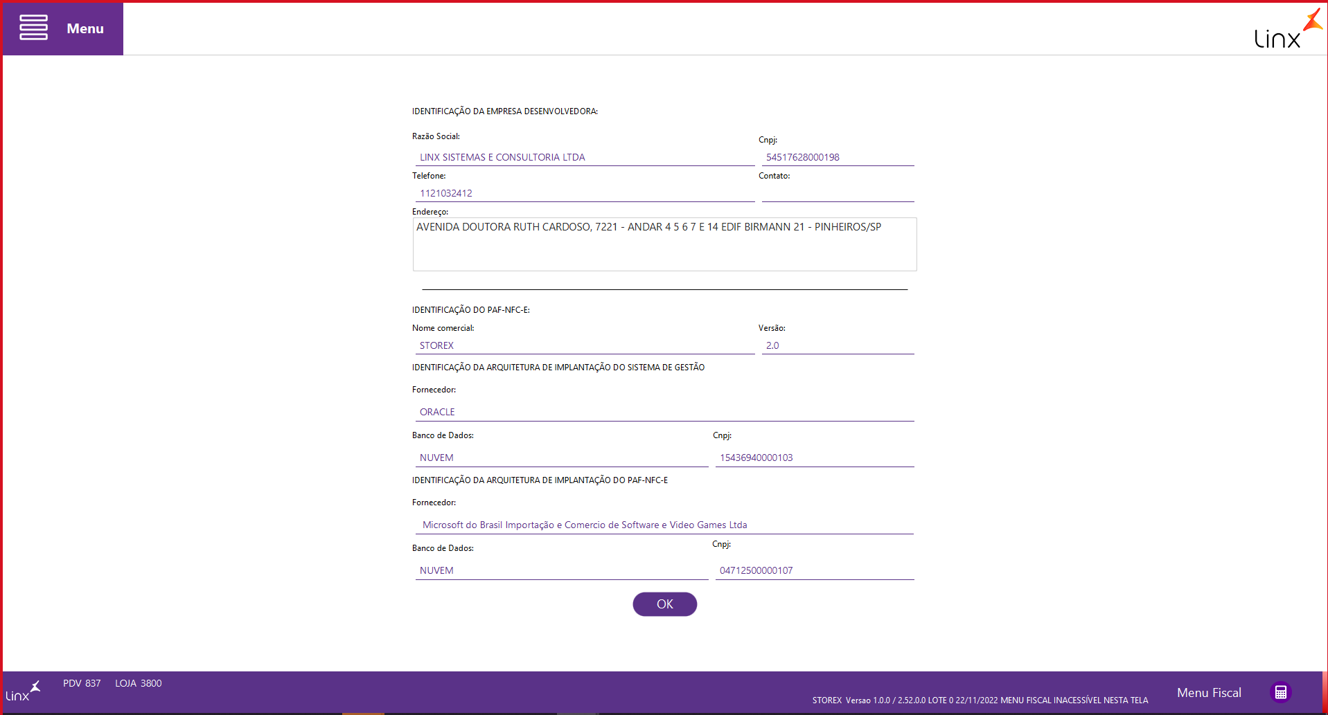 Opção 1 - Identificação do PAF-NFC-e Nesta opção são exibidas as informações sobre a Linx como é solicitado no documento ATO DIAT nº 38/2021 emitido pela SEFAZ. Storex exibe uma tela informativa cos dados da empresa desenvolvedora e a identificação da aplicação cadastrada junto a SEFAZ SC. Os dados exibidos na tela são recuperados da tabela IDENTIFICACAO_PAF_NFCE que é preenchida no processo de atualização da versão do BD-STOREX que contém os dados fiscais homologados e cadastrados junto ao órgão fiscal competente. | |