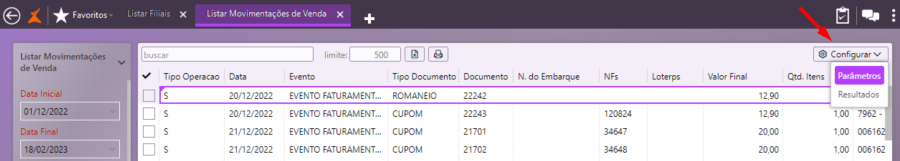 Os parâmetros são os campos de filtros que preenchemos para que o sistema nos apresente um determinado resultado de uma consulta feita. Por exemplo: Data Inicial e Data Final, Gerador, Evento, Filial etc.