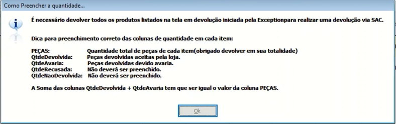 É obrigatório devolver a quantidade total de peças de cada item. Qualquer divergência o sistema apresentará a seguinte mensagem: