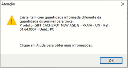 5. Na tela Indicação de Item de Troca, informe os produtos e suas respectivas quantidades de acordo com a quantidade devolvida e a quantidade em avaria.