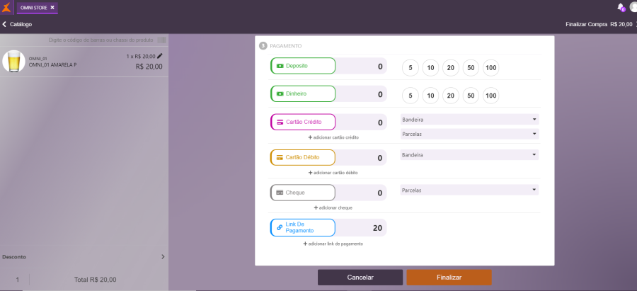 Na tela de finalização da venda, informe qual o valor a ser pago por meio do link de pagamento e clique em Finalizar.