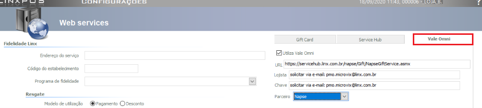 | VALE_OMNI_URL | Informação adquirida no Linx POS Manager, Configurações, Web Services, campo URL. A URL é padrão para todos os clientes Linx. Essa informação será fornecida pela empresa Napse.