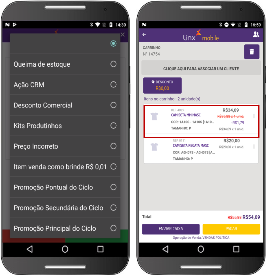 • Para clientes com ambiente Linx Microvix é necessário realizar algumas parametrizações no Linx Microvix POS para que o desconto seja corretamente habilitado no Linx Mobile. Consulte no manual do produto, como efetuar a parametrização, tópico Integração Linx Mobile / Parametrizações.