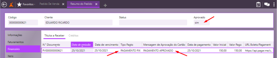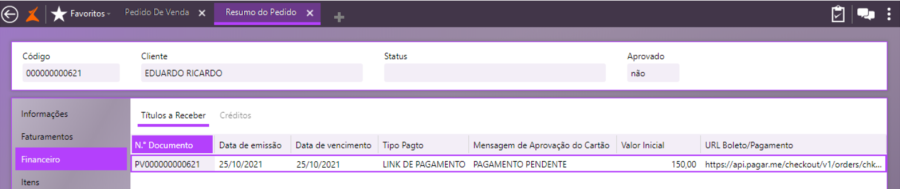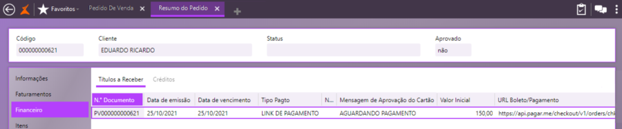Ao consultar novamente o resumo do pedido de venda, podemos observar que a mensagem de aprovação foi atualizada para Pagamento Pendente.