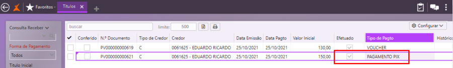 Ao consultar o título a receber gerado para o pedido de venda perceba que ele está efetuado e o tipo de pagamento foi atualizado para Pagamento PIX.