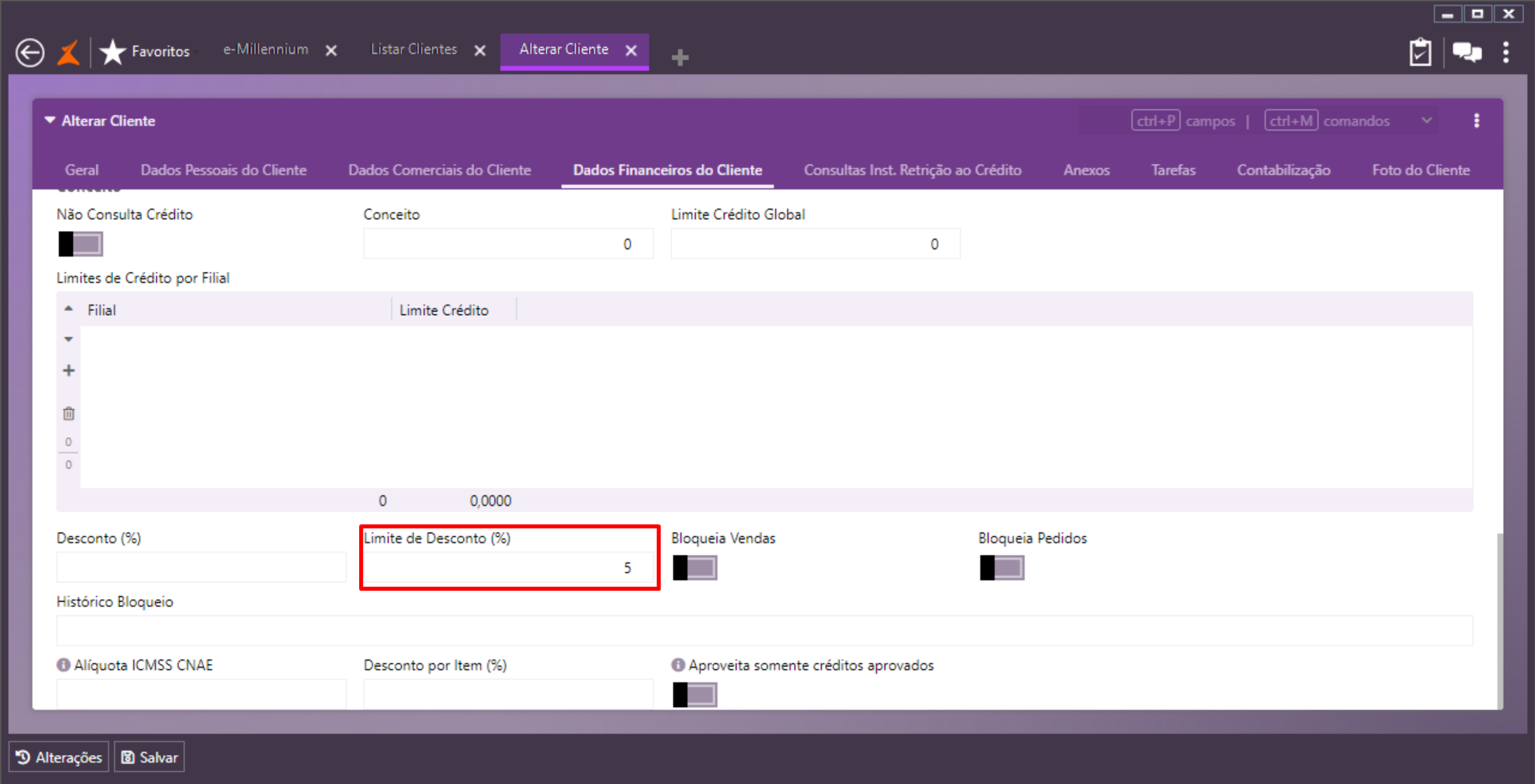 Quando o limite de desconto do cliente for maior que o do usuário (por exemplo: cliente, 10%, e usuário, 5%), ao definir 8% de desconto, por exemplo, o sistema irá permitir que o usuário efetive a venda mesmo com o desconto maior do que ele tem permissão, pois, conforme o cadastro no e-Millennium, há um desconto estipulado e que deve ser garantido ao cliente.